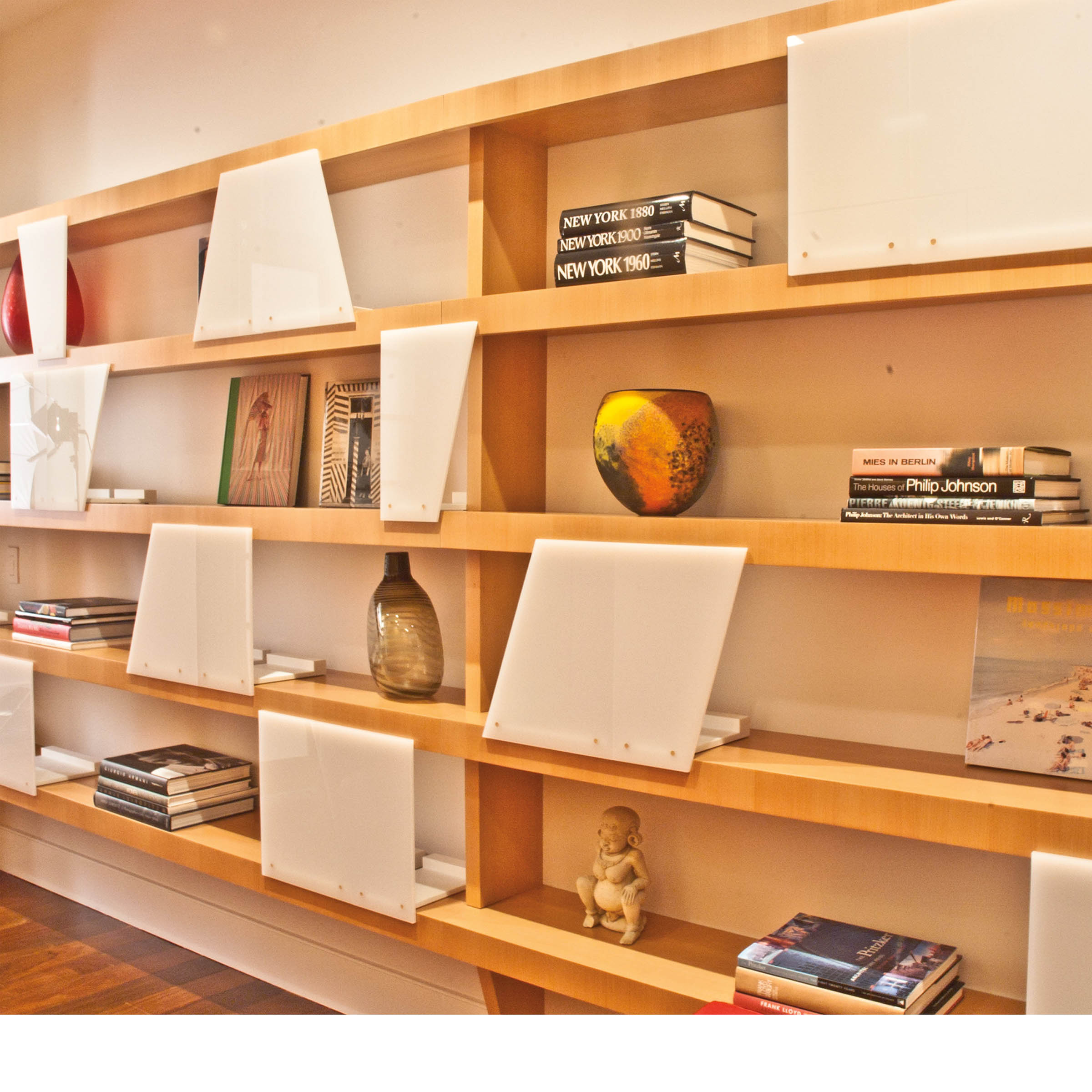 Strategic openings and the discreet use of folding screens and pocket doors allow the flexible use of space in a quiet, unobtrusive manner. Wood panels and millwork create the articulation of planes, enhancement of scale and organization of storage and displays.