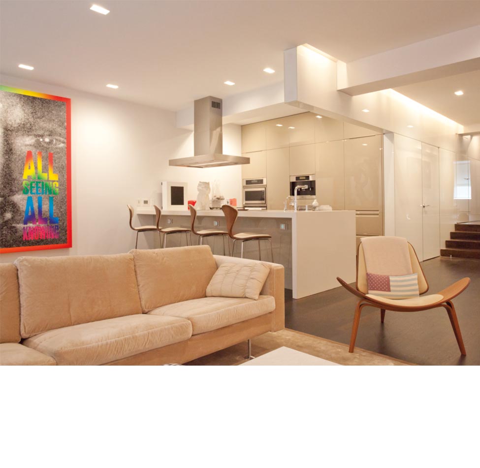 Designed as a pied-a-terre for an art collector,the public spaces are opened up to allow the relaxed viewing of large scale pieces. Two large building service cores disrupted the middle of the footprint. Large white glass planes shift past each other in an asymetric layout. Spaces front to back are able to glide and flow past one another. The impact of the static cores is elimnated while the depth of the white glass subtly creates depth at the interior.