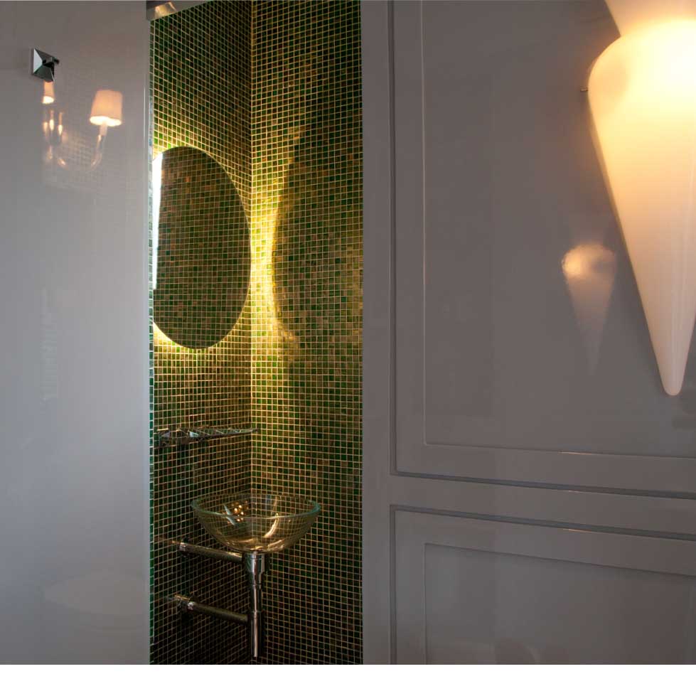 To give the apartment greater expansiveness, the turning stair acts as a pivot point, reorienting one from the lower level, oriented north-south, to the upper level, oriented east-west. The master suite and boy’s rooms are hidden just behind the central stair. The study, with custom teak desks and flannel wall panels, creates a warm niche behind a large sliding wall panel off the entry gallery. Teak battens line the gallery and wrap up the curved stair to the dining room. On the upper level, the living and dining areas are bracketed by the kitchen on the east and a small “jewel box” sitting room and powder room on the west, lined in high-gloss purple and gray lacquer, respectively.