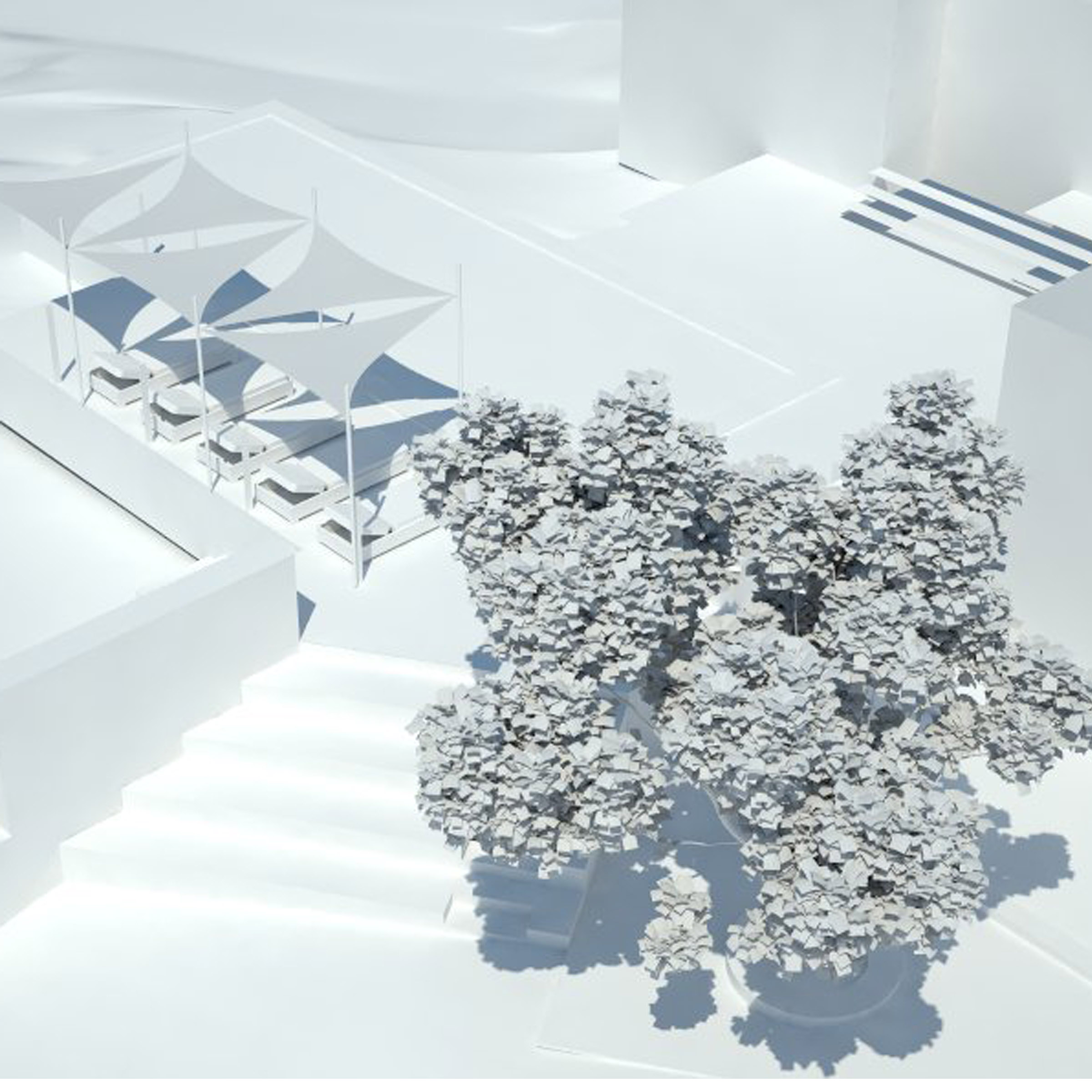 The scheme for the pool area and garden extended the plane of the wood deck to create a more generous scale and increase the sense of floating atop a hill. Sail like canopies cover the lounge area and recall the bay just across the street. The grand wooden stair creates an easy connection between lawn and pool; its scale relates to the scale of the larger property, thus increasing a sense of openness and calm.