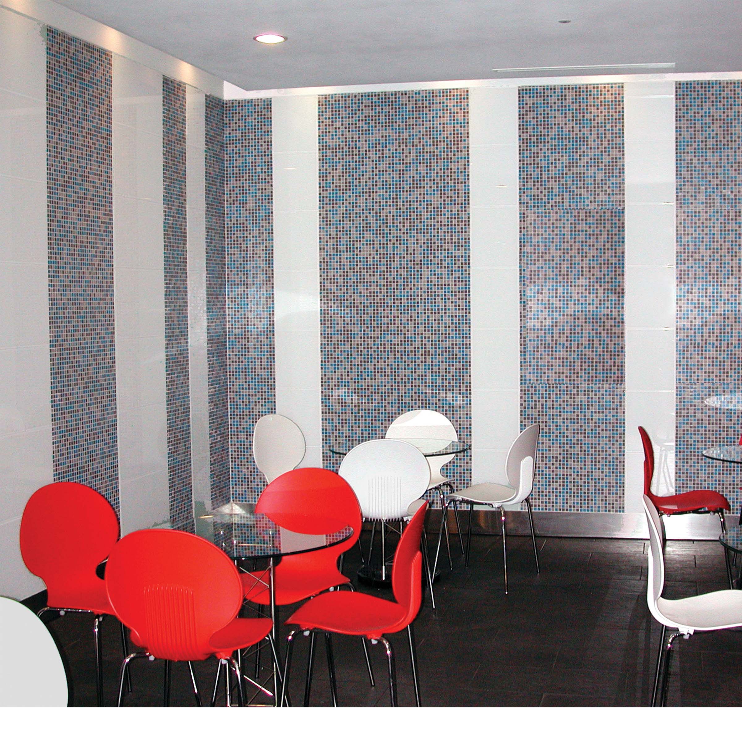 Alternating structural glass panels and translucent glass mosaic patterns the renovation of this prime downtown shopping arcade. The pattern is used to either accelerate or decelerate the proportion of a given field, progressing from the core to the release points up to the street. This configuration resists the monotony of the endemic Mall type and reinforces irregularity and objectivity as needed elements of movement through the space.
